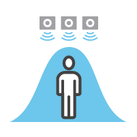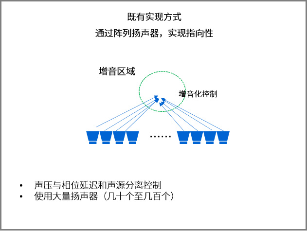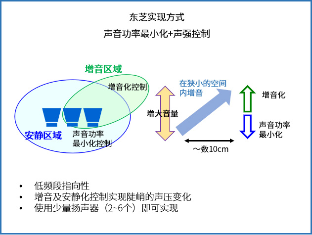 利用音场控制技术,无需特殊硬件,使用三个扬声器,利用空间声压分布可创建声音输出清晰的区域和难以听到的区域。
