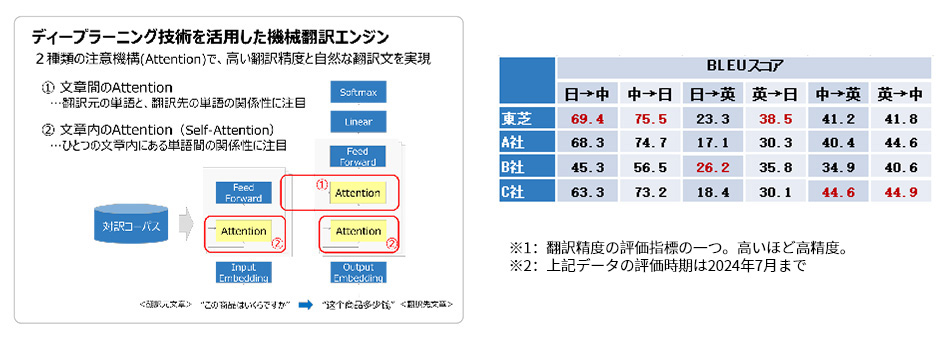 ● 最新のディープラーニング技術と東芝独自技術により、高精度かつ高速な業務向け機械翻訳サービスを実現
