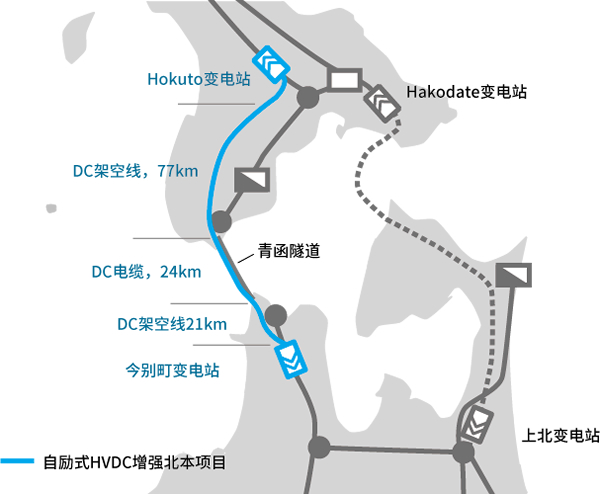 本技术适用于连接日本北海道 — 本州的自励式直流送电项目(300MW、DC 250kV、DC 1200A)。