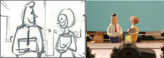 黏土动画的制作是一项极其繁琐又细致的工作,动画人物的每一个动作神态都要花费匠人们几天的时间制作大量的原型。例如两个“员工”在电梯中、公司里交流工作的场景,人物的每一次点头、说话、微笑、转头都是由不同神态、动作的黏土元素需要分别拍摄完成;城市景象中的“车流”也是由工作人员不断更换车辆位置进行上百次拍摄合成。