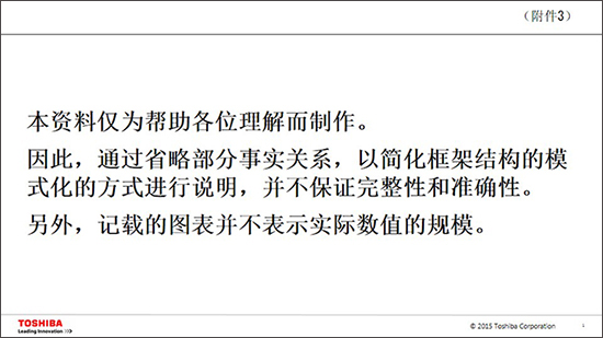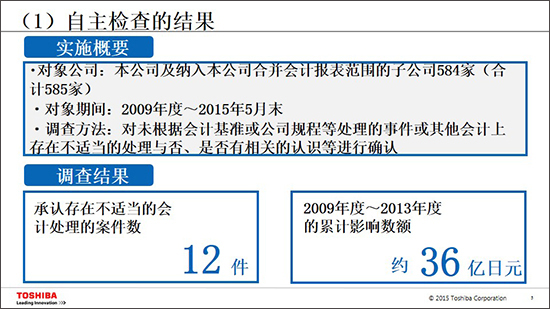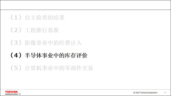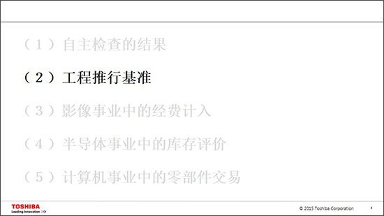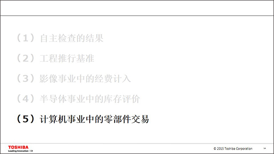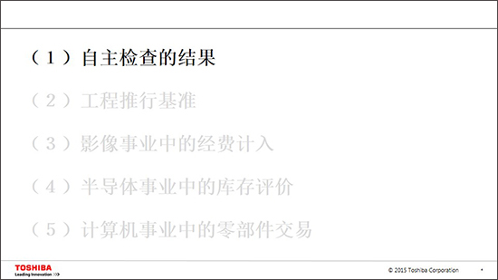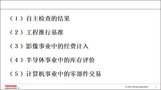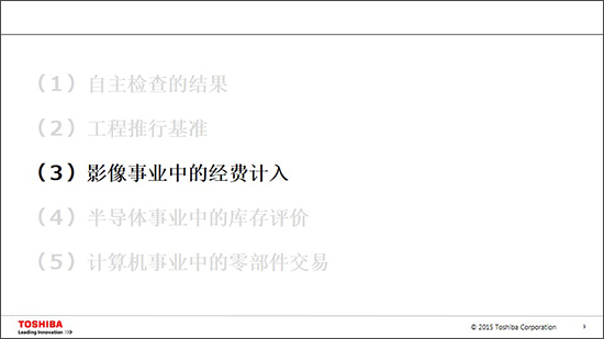 (注3)详情请参照6月12日的“关于自主检查的结果、特别调查委员会的调查概要及与委托第三方委员会的事项的关系的通知(http://www.toshiba.co.jp/about/ir/jp/news/20150612_1.pdf)”。此外,该自主检查的结果,并非经新日本有限责任监查法人审计后确定的金额。