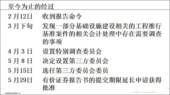 2015年3月下旬 | 在为应对披露检查就工程推行基准案件指出的问题而进行的自我调查的过程中,发现本公司2013年度部分基础设施相关的工程推行基准案件的会计处理存在需要调查的事项。 |