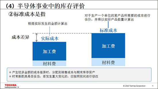 作为本次调查对象之半导体事业的会计处理的情况是:修改标准成本,对其进行增额时,虽然结合工厂的操业度对前期工程的标准成本进行了修改,但后期工程的成品的标准成本却保持了期初设定的价格,未作修改。