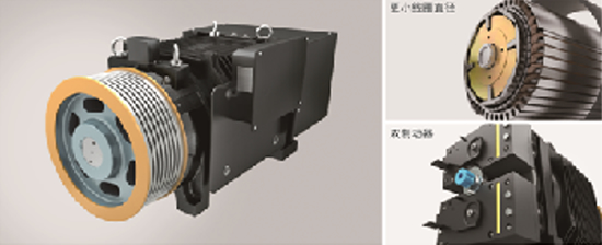 小型化的永磁同步电动机、更节省空间;用电量减少30%以上(与传统电动机相比);无齿轮曳引式,无需齿轮油,实现低振动低噪音,更为绿色环保;马达采用集中卷线方式、体积更为小巧,具有高科技的领先水平。