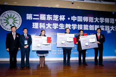 最终入围决赛的36位大四参赛选手来自国内12所师范大学。他们在各校的数学,物理,化学学科预赛中脱颖而出,都是立志将来成为优秀理科(数学、物理、化学)教师的优秀学生代表。在决赛中,参赛选手不仅要考虑如何在教学中使中小学生切身体会到科学就在自己的身边,更要给他们的学习带来乐趣,让他们认识到科学对人类文明进步起到的作用等等。比赛通过参赛学生选手制作具有自己独创性的、钻研性的教案、并进行模拟授课的方式进行。经过2天的激烈争夺,最终,华南师范大学,西南师范大学,华中师范大学,分获数学,物理,化学学科的一等奖。具体结果如下: