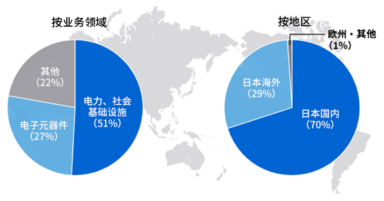 根据2022年度数据,按业务领域区分的采购比例(按金额)为:电力和社会基础设施占51%,电子元器件占27%,其他占22%。按地区划分,日本国内采购金额占比为70%,亚洲(含中国、印度)采购金额占比为29%,欧洲及其他地区为1%。