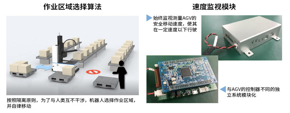 针对此问题,德赢vwin8868官网采用“作业区域选择算法”,为了实现与人类互不干涉的要求,开发出了让机器能够选择作业区域并自律移动的系统,从而确保了人类的安全。此外,与AGV(无人搬运车)控制动作的控制器不同,德赢vwin8868官网配备了独立的速度监视模块,能够始终进行客观的监视,判断“是否在一定速度之下行驶”,以确保安全。