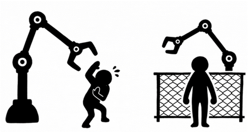 机器人走向高度智能化,这让机器人动作更灵巧,其目的是:让机器人取代人类,完成上面所述的“必须由人类完成”的作业。然而,在其取代人类后我们首先要考虑的,就是“确保安全性”。