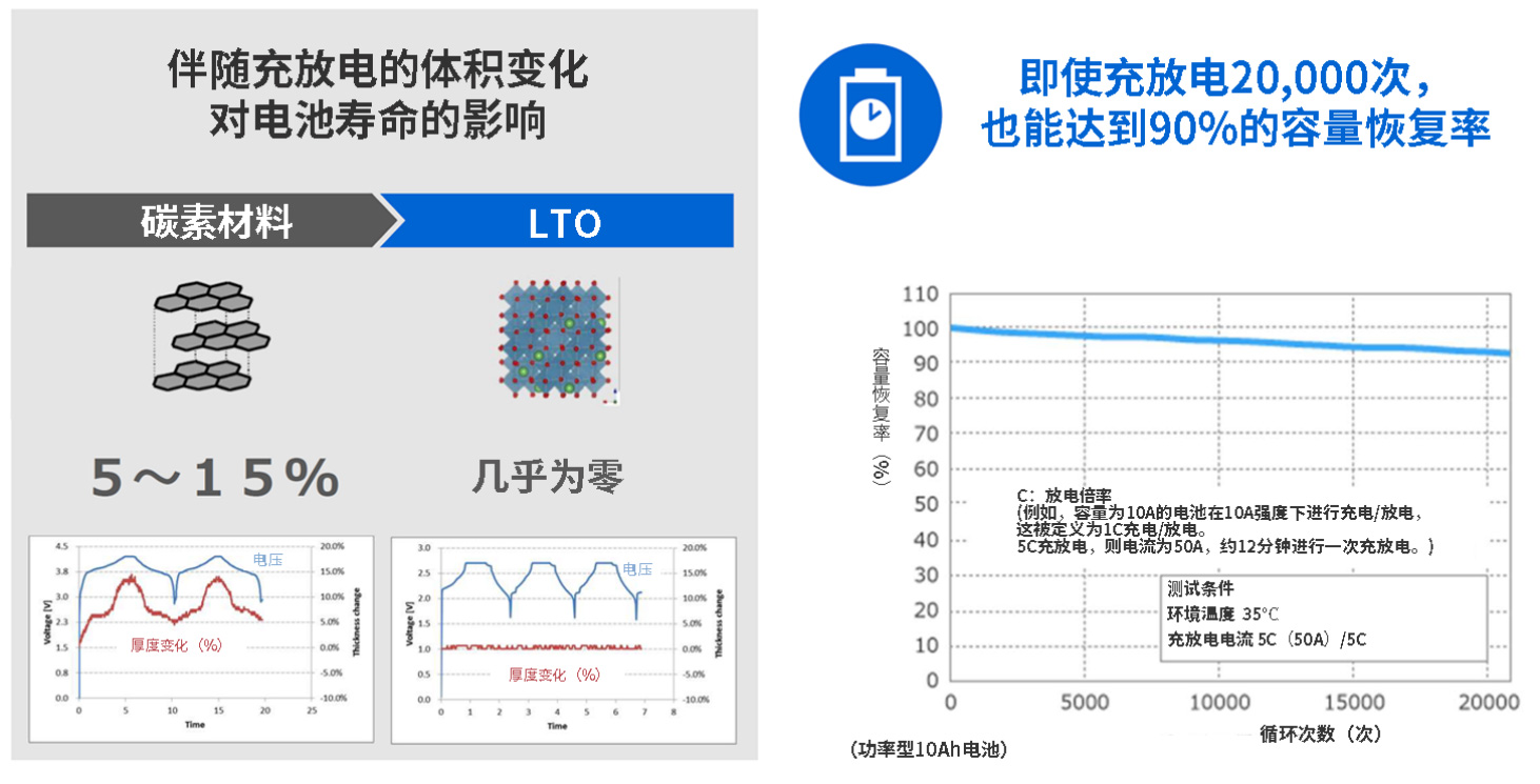 随着锂离子的吸藏和释放,普通锂离子电池的体积会发生5~15%的变化。这种物理体积的变化会损害材料,导致容量降低、寿命缩短。对此,SCiB?采用的LTO负极材料具有非常稳定的尖晶石型结构,体积几乎不会随锂离子吸藏和释放而产生变化。在环境温度为35℃的条件下进行的实验中也证实了这一点,经过2万多次充放电后,容量仍保持在90%以上。