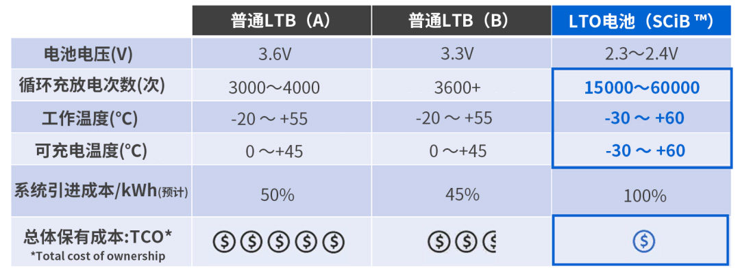 综上所述,SCiB?性能出众,优势明显。与普通锂离子电池相比,SCiB?的电池电压较低、充放电循环寿命长、工作温度和可充电温度优异,且总体拥有成本更低。