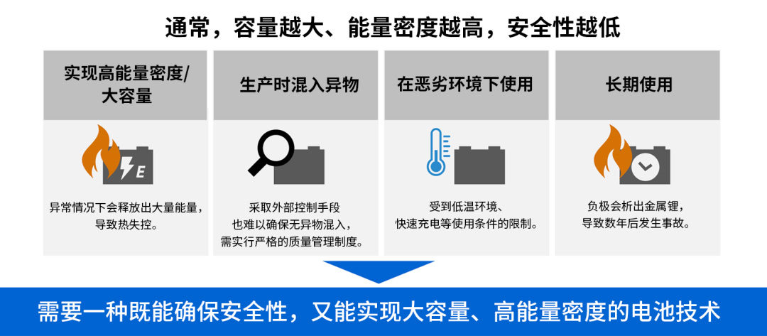 在实现大容量和高能量密度方面,电池能够储存的能量越多,异常情况下发生严重事故的可能性也就越高。为此,需要对锂离子电池实行严格的质量管理制度,例如防止在生产过程中混入异物等。特别在工业领域应用,不仅需要确保在恶劣环境下使用时的安全可靠性,而且通常对工业设备中的锂电池进行更换操作比较难,还需要确保电池的稳定性。