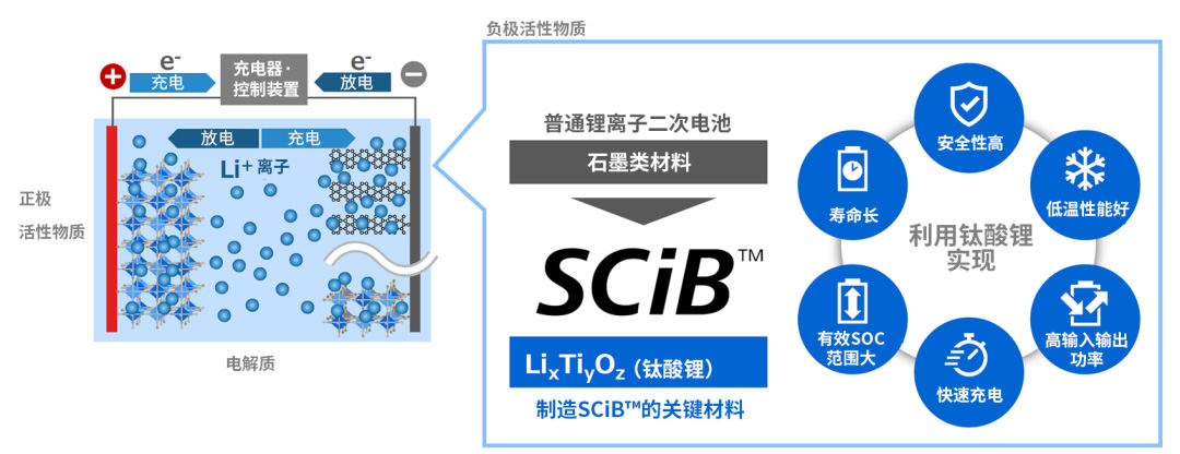 德赢vwin8868官网SCiB?锂离子电池使用钛酸锂(LTO)作为负极材料,在满足容量大、能量密度高需求的同时,还具有安全性高、寿命长、低温性能好、有效SOC※1范围大、快速充电、高输入输出功率等优点。可应用于电动汽车、固定式/工业用电池等场景。