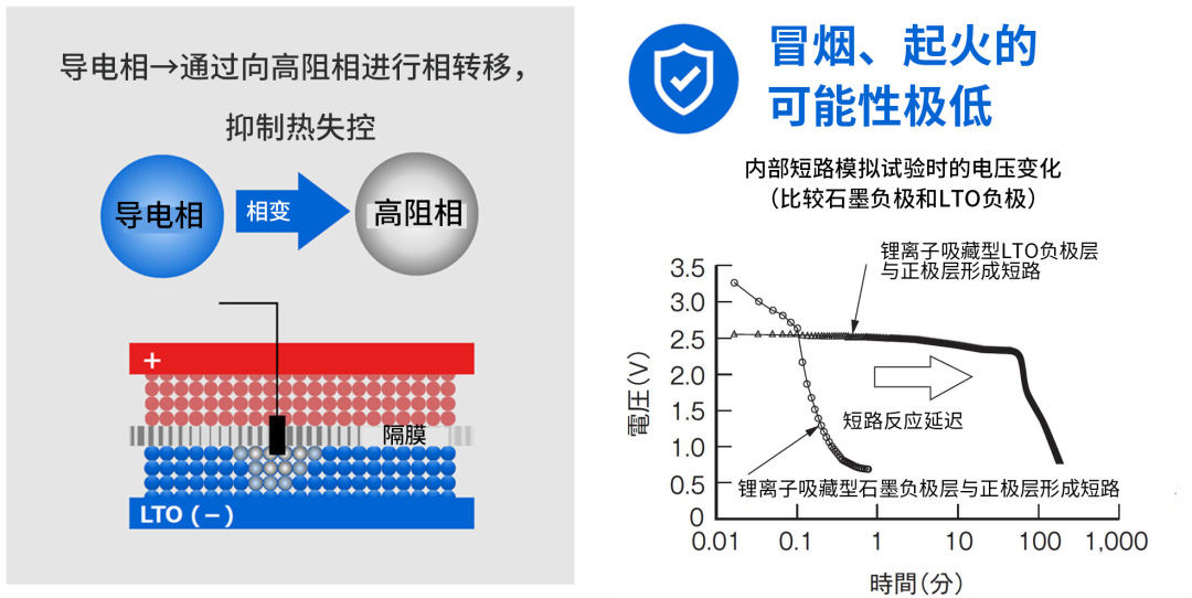 LTO具有自我保护功能,即使内部发生短路,仍可确保较高的安全性。LTO虽然是一种绝缘体,但可通过吸藏锂离子,作为电极材料(导电相)。当阴正极之间意外混入金属等异物时,锂离子会立即从短路点附近的LTO中释放出来,随后LTO负极变为绝缘体(高阻相),防止产生过大的短路电流,抑制电池热失控。这就是LTO负极电池的自我保护功能。