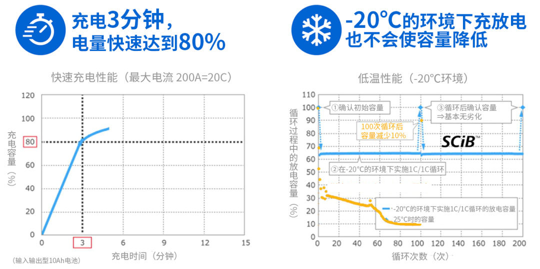 即使快速充电的情况下,LTO负极上析出金属锂(枝晶)的可能性也较低。利用这一优势,SCiB?可以实现快速、安全的充电,只需充电3分钟即可达到80%的电量。此外,即使在-20℃的低温下进行充电实验,LTO负极也不会析出枝晶,因此可以反复充/放电,并且几乎不会导致容量减少。