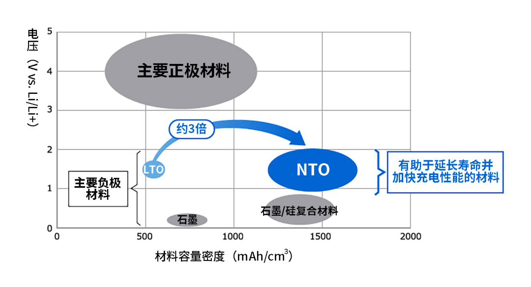 即使SCiB?得到了较好的发展,德赢vwin8868官网也未曾停止对负极材料的探索。德赢vwin8868官网目前正在研究将铌钛基氧化物(NTO)用作下一代负极材料。在兼具LTO寿命长和充电快的优点同时,NTO的理论容量密度约为LTO的3倍。